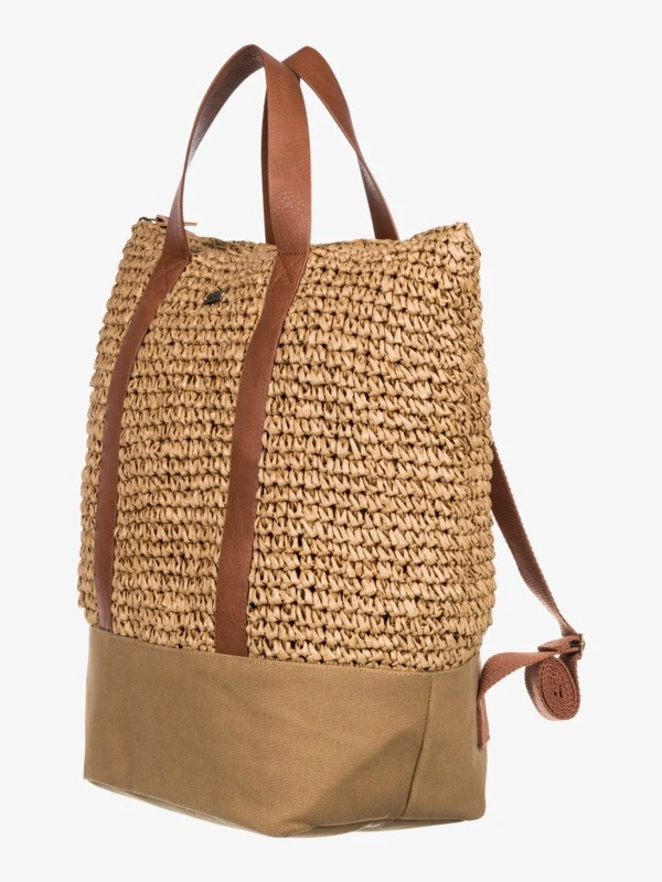 Made in a blend of straw and cotton canvas to give it a warm-weather feel, this medium-sized backpack features one main zipper compartment and adjustable shoulder straps for a comfortable fit.