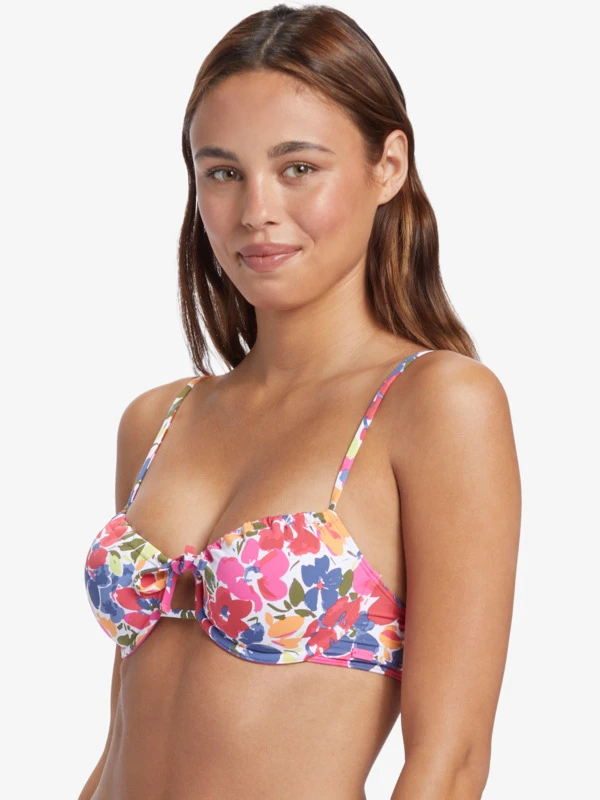 Made of recycled nylon (so it’ll stay soft and strong), the Bloomin Babe underwire bralette bikini top adds contemporary style with a floral print, gathers, and a front tie. Complete with adjustable straps and a back hook closure.