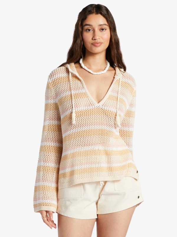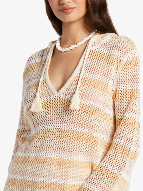 Made of a soft sweater knit, this hooded poncho top has a plunging V-neck with drawcord tassels and flared long sleeves. An effortlessly cool look for your next beach bonfire.