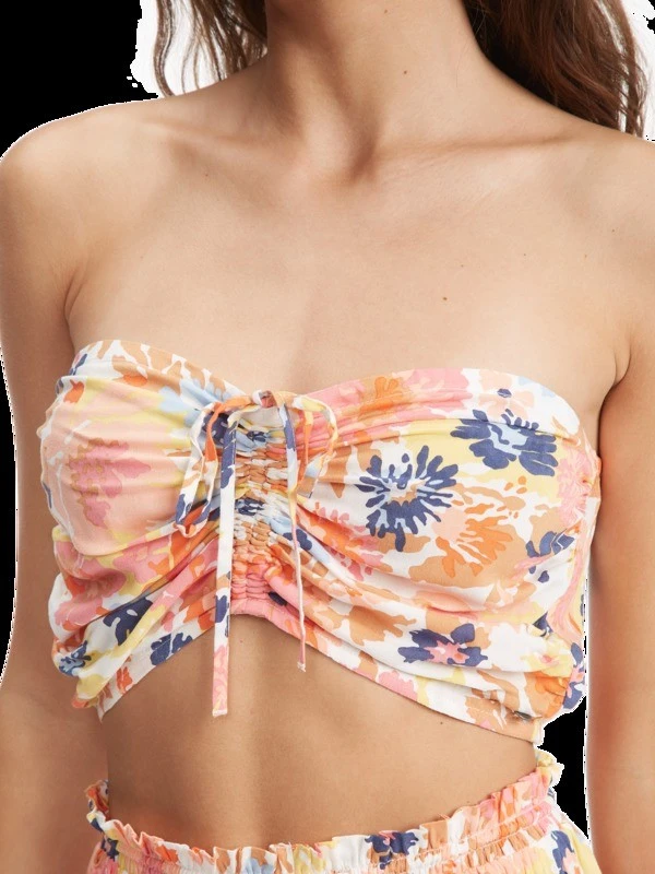 Made of soft viscose fabric, this printed crop top has a smocked back panel to hug your figure and ruching at the front with an adjustable tie that converts to a halter or a tube top.