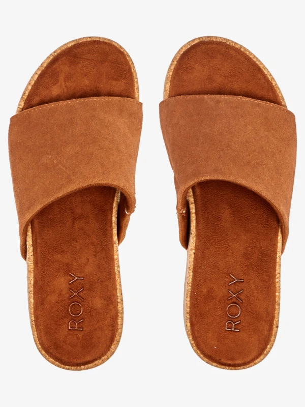 Add instant height with these ROXY FASHION platform slide sandals made with a genuine suede leather upper, a soft microfiber footbed, and a natural cork-wrapped sole.