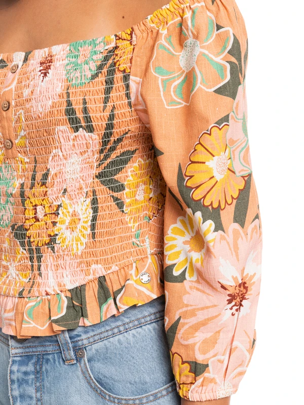 Perfect for spring and summer, this off-the-shoulder top is a warm-weather essential. Crafted from midweight cotton viscose slub, the printed top features 3/4 sleeves and a flattering smocked body that accentuates your figure. Pair with the Cosmic Glow Again skirt.