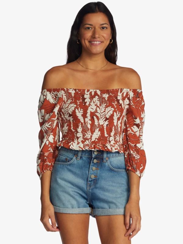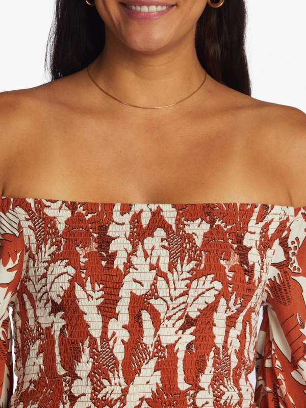 Made of textured dobby cotton, this printed off-the-shoulder top has long puff sleeves, a hem ruffle, and a smocked body that fits your shape. Perfect with a trusty pair of cut-offs.