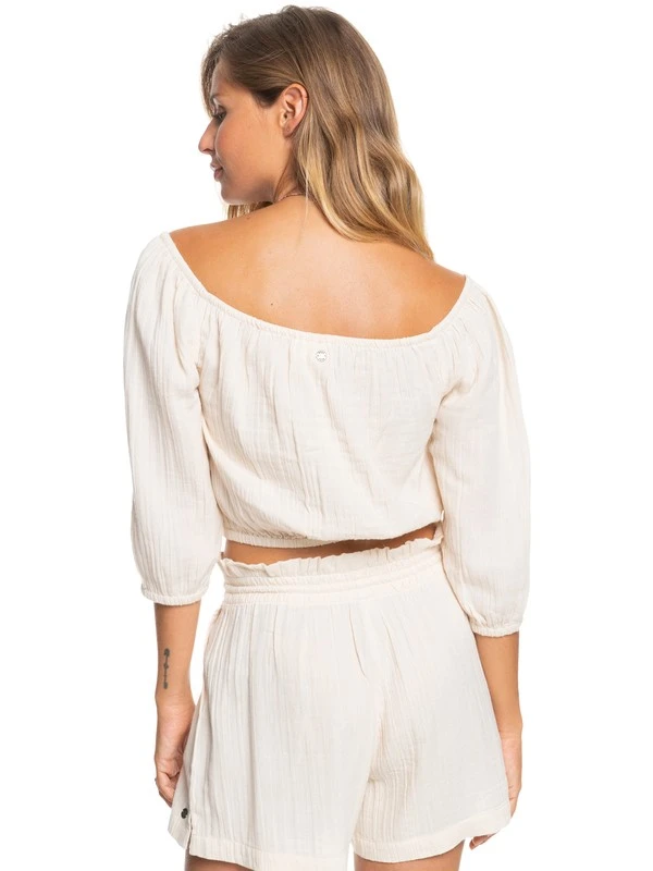 Update your summer wardrobe with this off-the-shoulder crop top for women. Crafted from doubled layered yet super lightweight cotton fabric, the flowy top features a comfy fit with a front tie closure and short puffy sleeves.