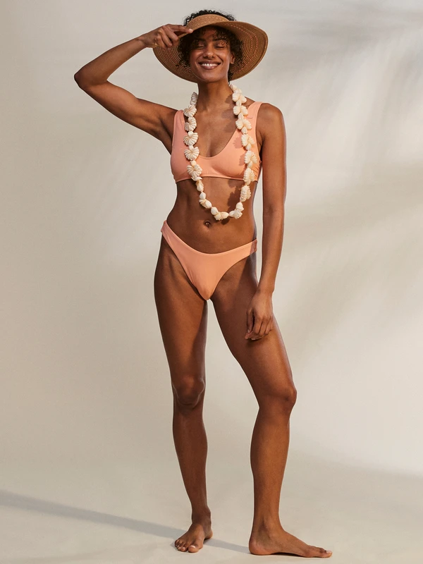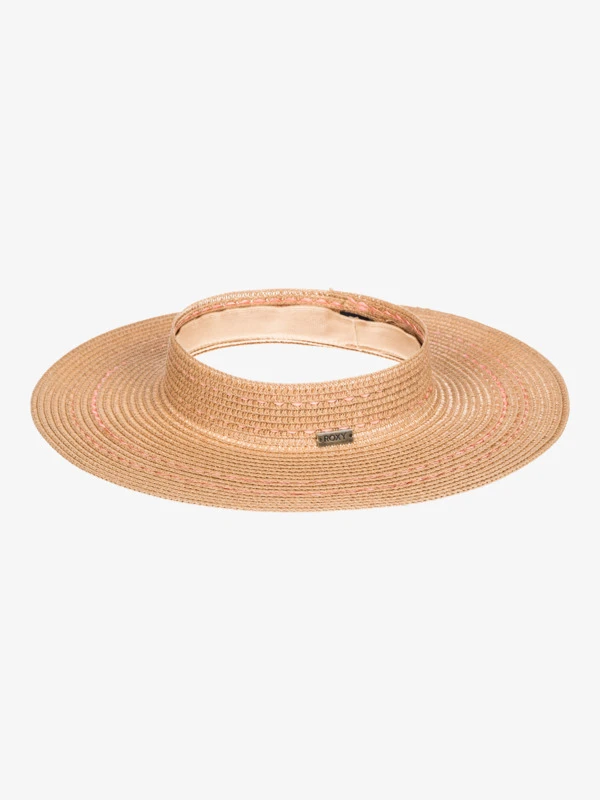 This crownless straw sun hat has a stitched pattern and a wide brim. Our solution to hats and ponytails.